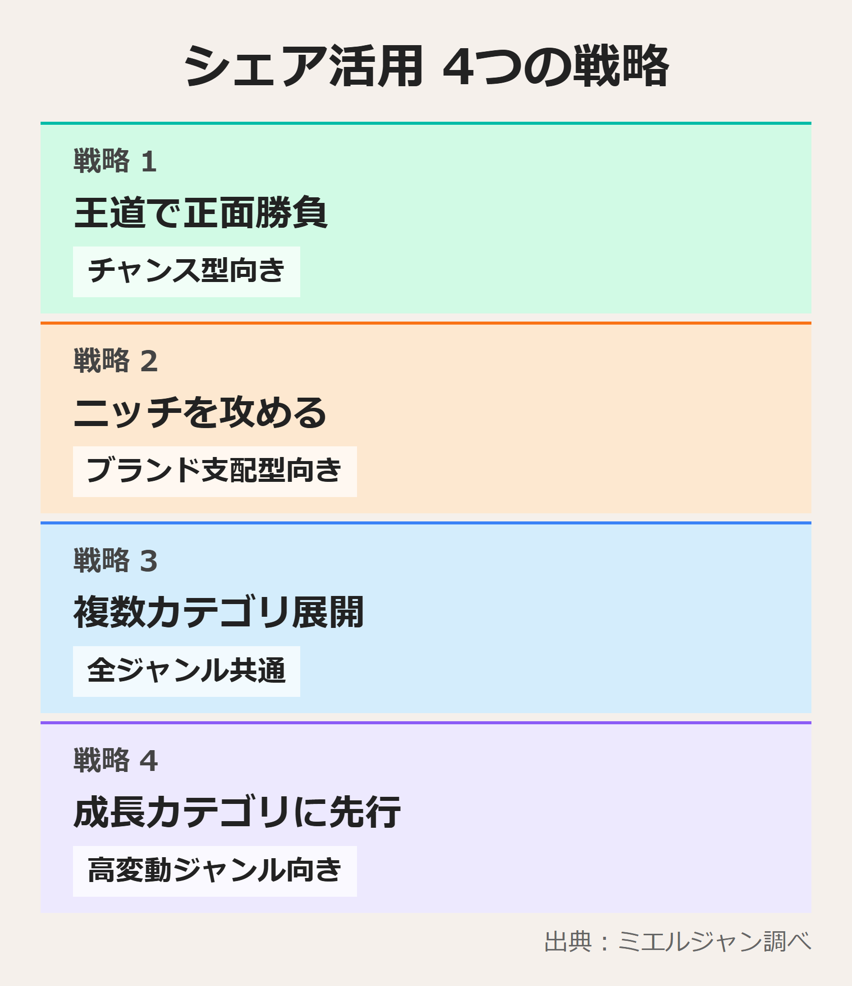 カテゴリシェアを知ることで、ジャンル全体の中で自社がどの「土俵」で戦うかを選べるようになります。