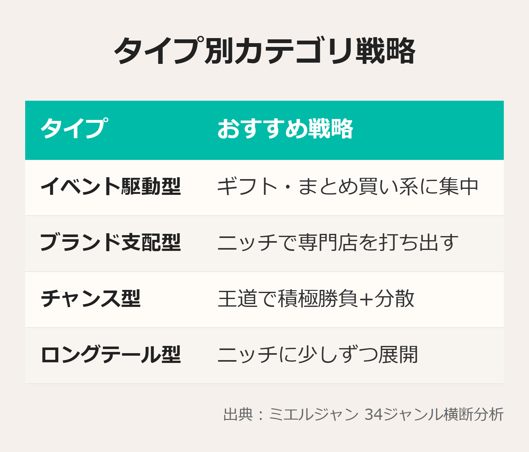 このアプローチは「ブランド支配型」のジャンルで特に有効です。メインカテゴリでは上位ショップが強固なため、ニッチ領域で独自のポジションを築く方が現実的です。