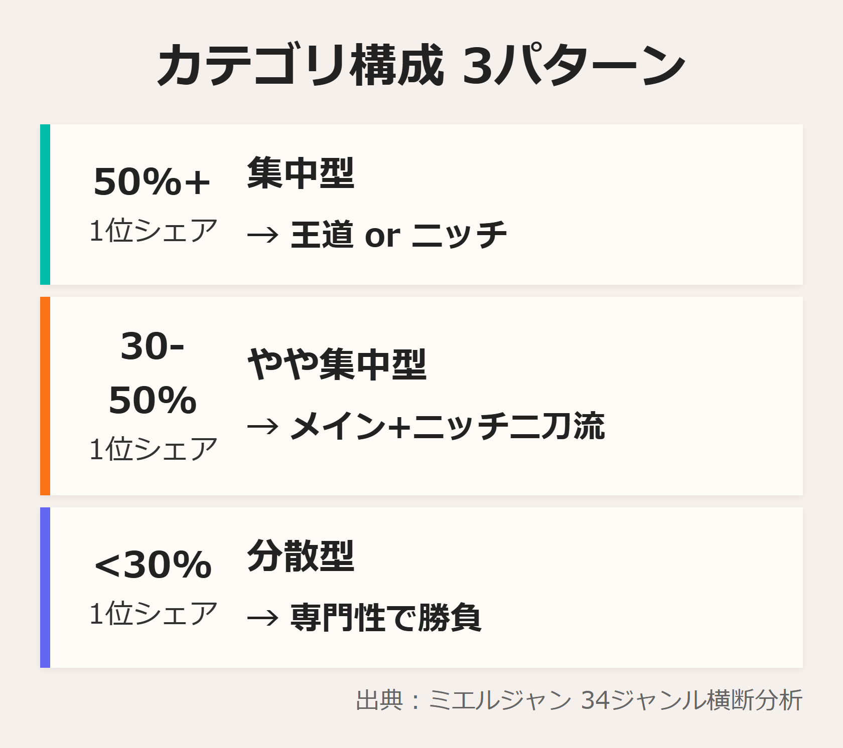 やや集中型(1位シェア30〜50%) | メインカテゴリが強いが2番手以降にも市場がある | メインカテゴリ+ニッチの二刀流も可能 |