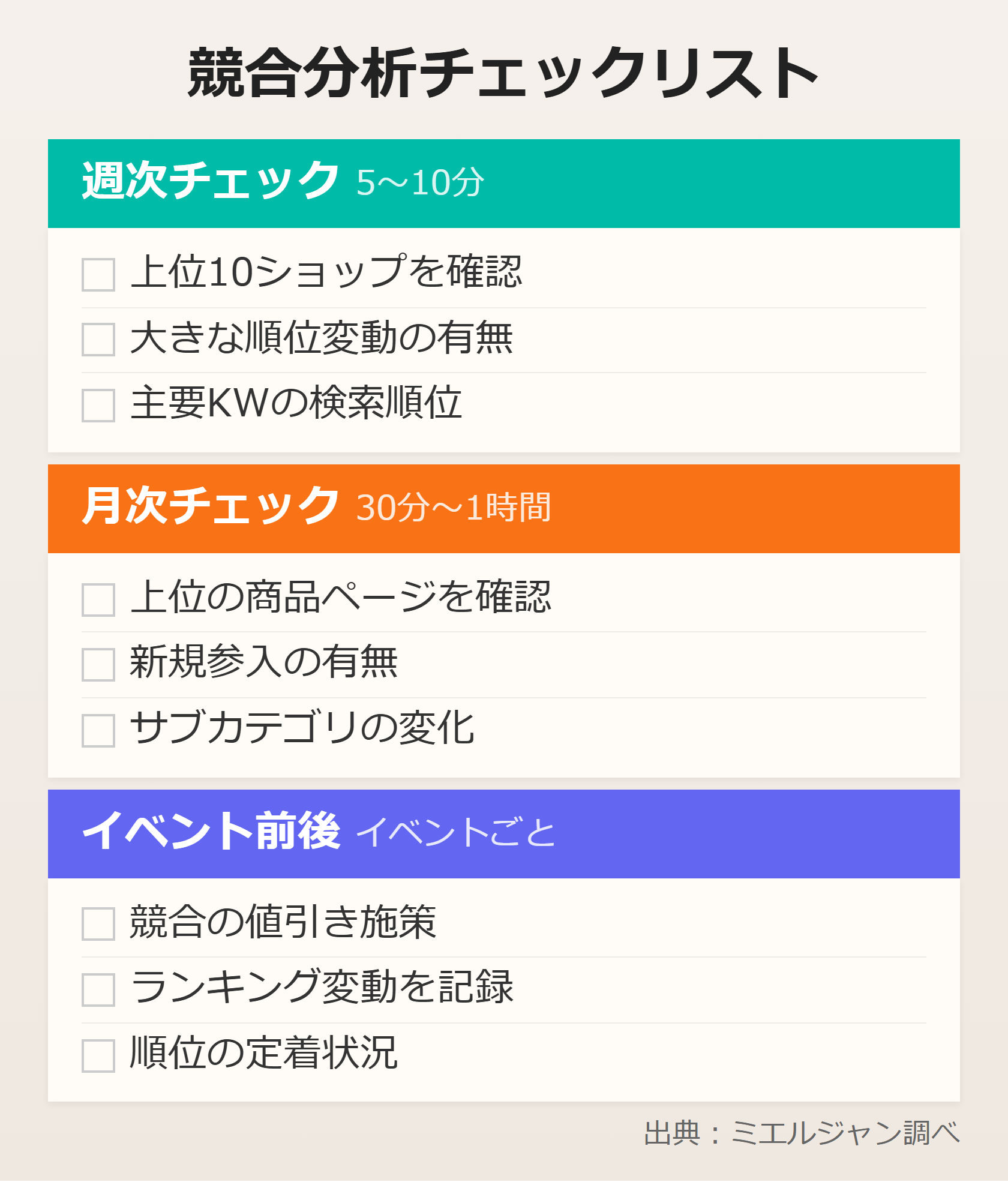 競合分析は一度やって終わりではなく、定期的に続けることで変化に気づきやすくなります。週1回のランキングチェック、月1回の競合ページ確認、イベント前後の施策観察——小さな習慣の積み重ねが、競争優位につながります。