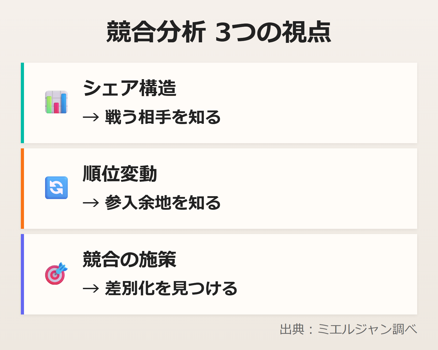 ひとつ大事なポイントがあります。競合分析は「競合と同じことをする」ためではなく、自分のポジションを客観的に把握し、差別化の方向性を見つけるために行うものです。
