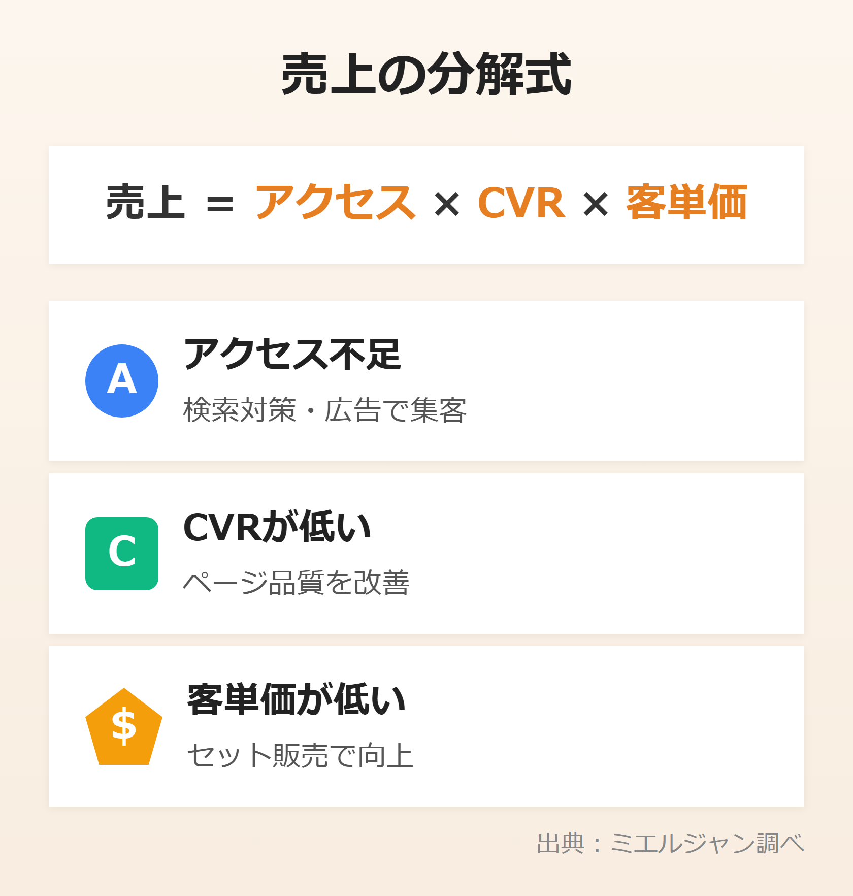 売上 = アクセス数 × 転換率(CVR) × 客単価