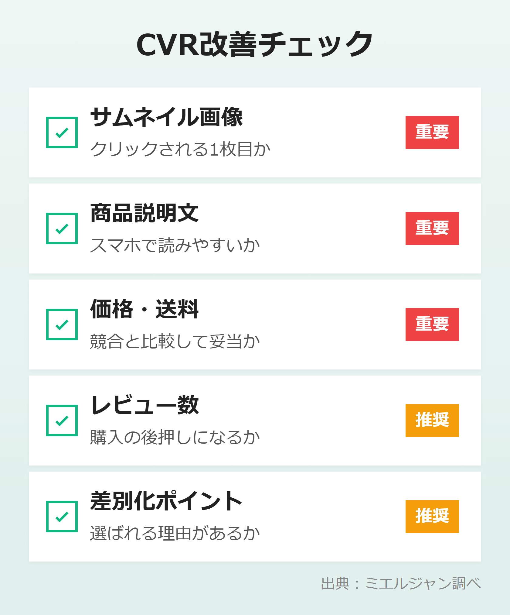 アクセス数はそこそこあるのに購入につながらない場合は、転換率(CVR)に課題がある可能性が高いです。商品ページの品質を見直すことで改善が期待できます。