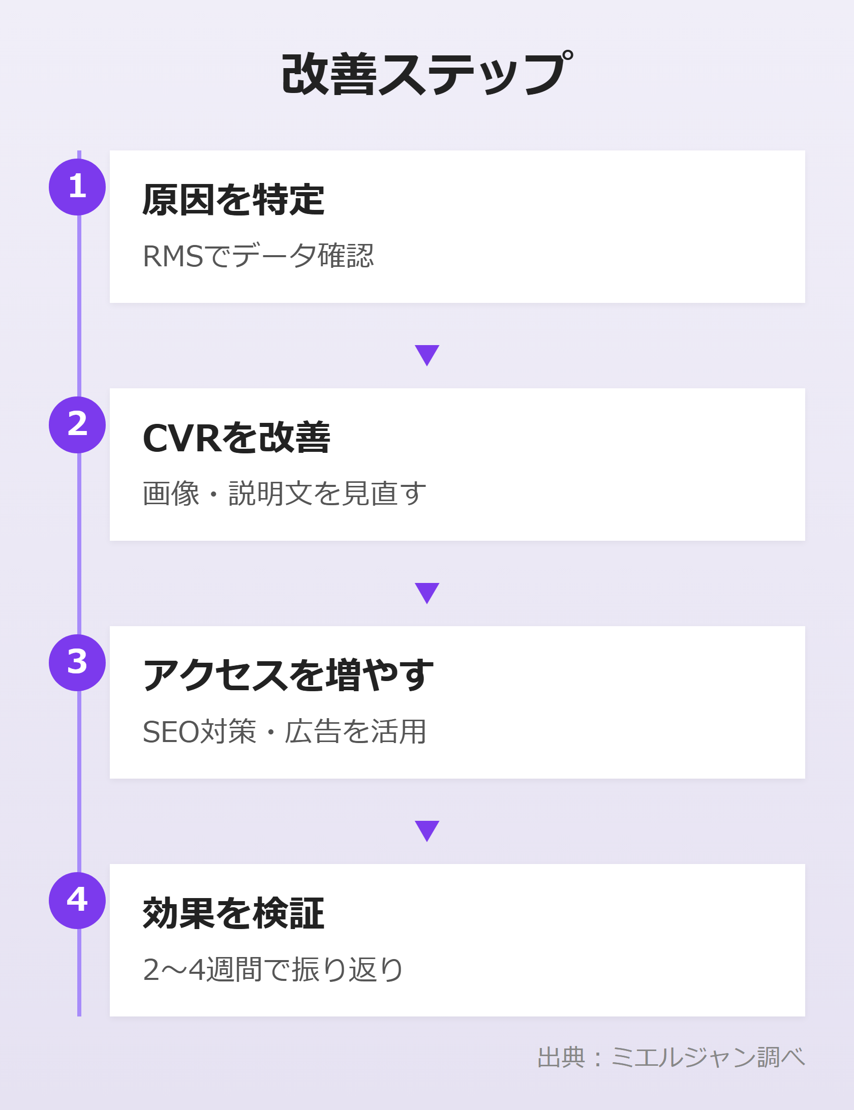 改善の順番としては、まず転換率(CVR)を改善してからアクセスを増やすのが効率的です。商品画像やページの情報を充実させてCVRを高めたうえで、検索対策や広告でアクセスを増やすことで、売上につながりやすくなります。