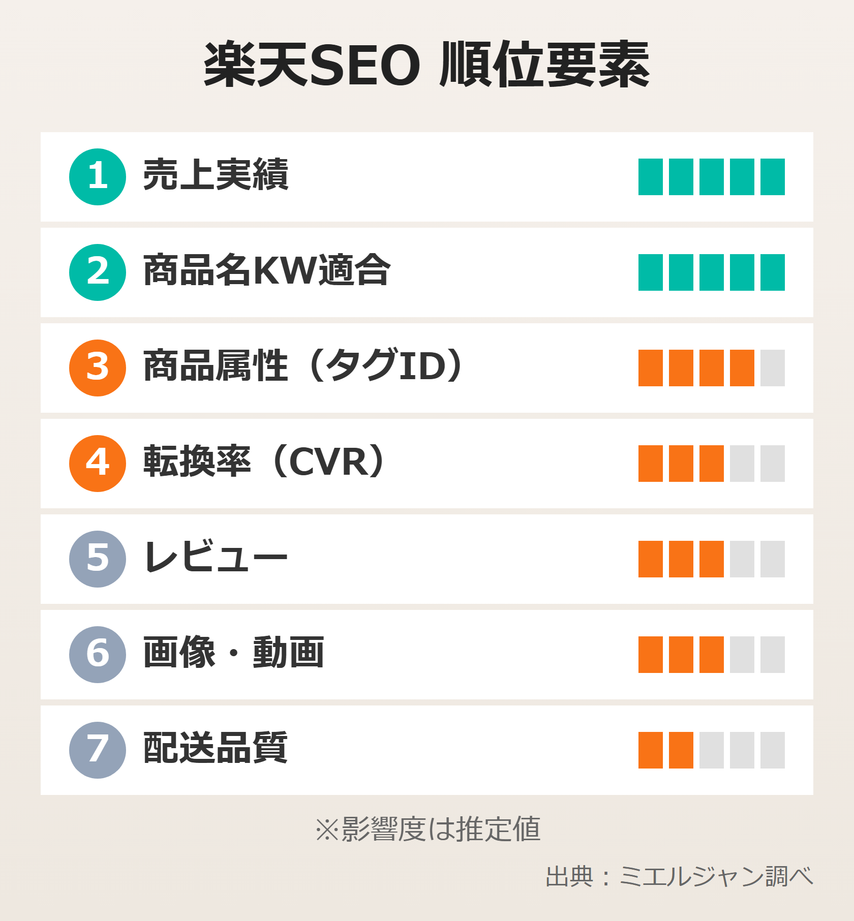 検索結果からクリックされた後に、実際に購入に至る割合です。CVRが高い商品は「ユーザーのニーズに合っている」と評価されやすく、検索順位にも好影響を与えると考えられています。