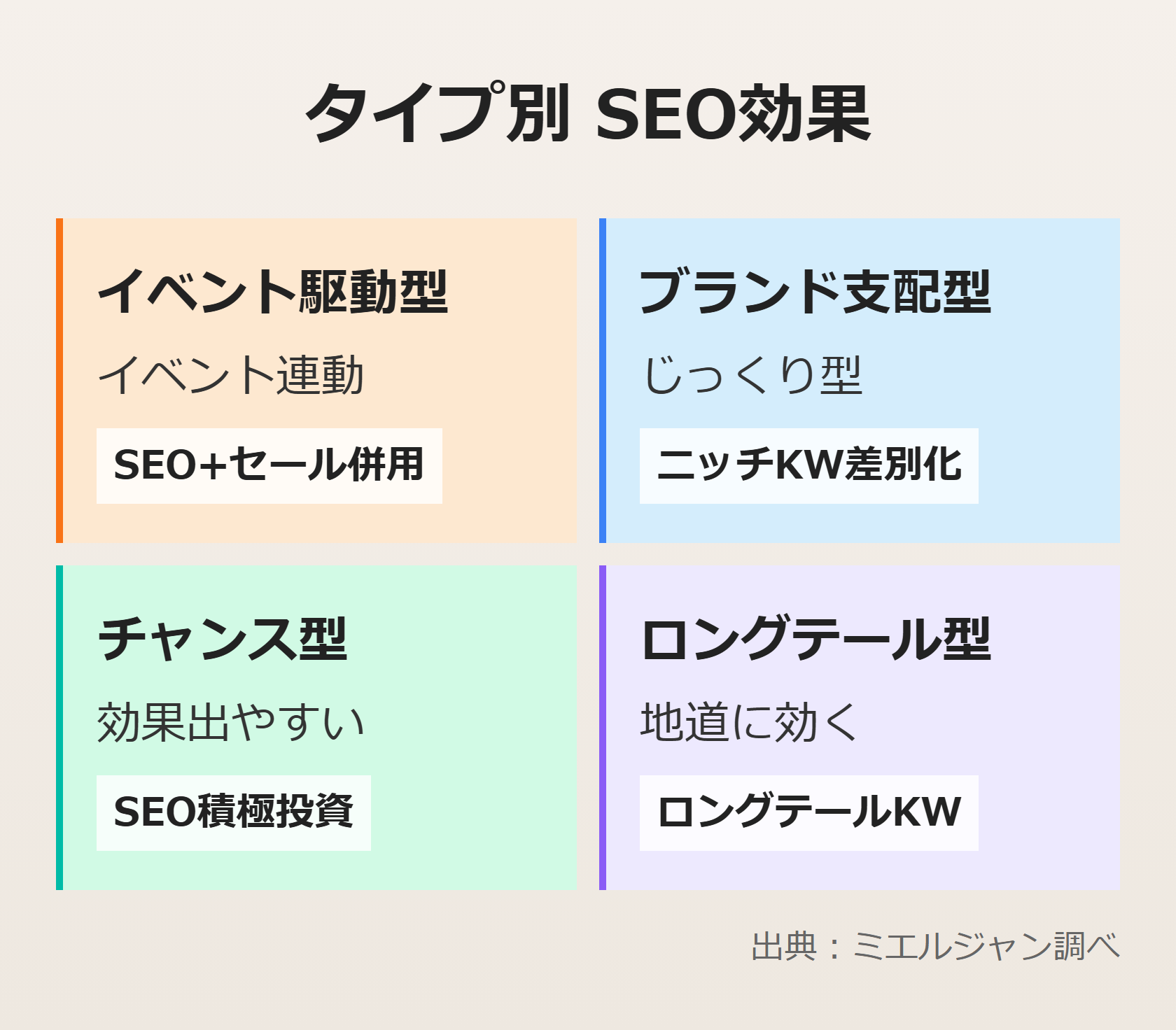 ミエルジャンで34ジャンルを分析すると、ジャンルによってSEO施策の効き方が異なる傾向が見えてきます。順位変動が大きいチャンス型ジャンルではSEO施策の効果が出やすく、上位が固定されているブランド支配型ジャンルではニッチなキーワード戦略が有効です。