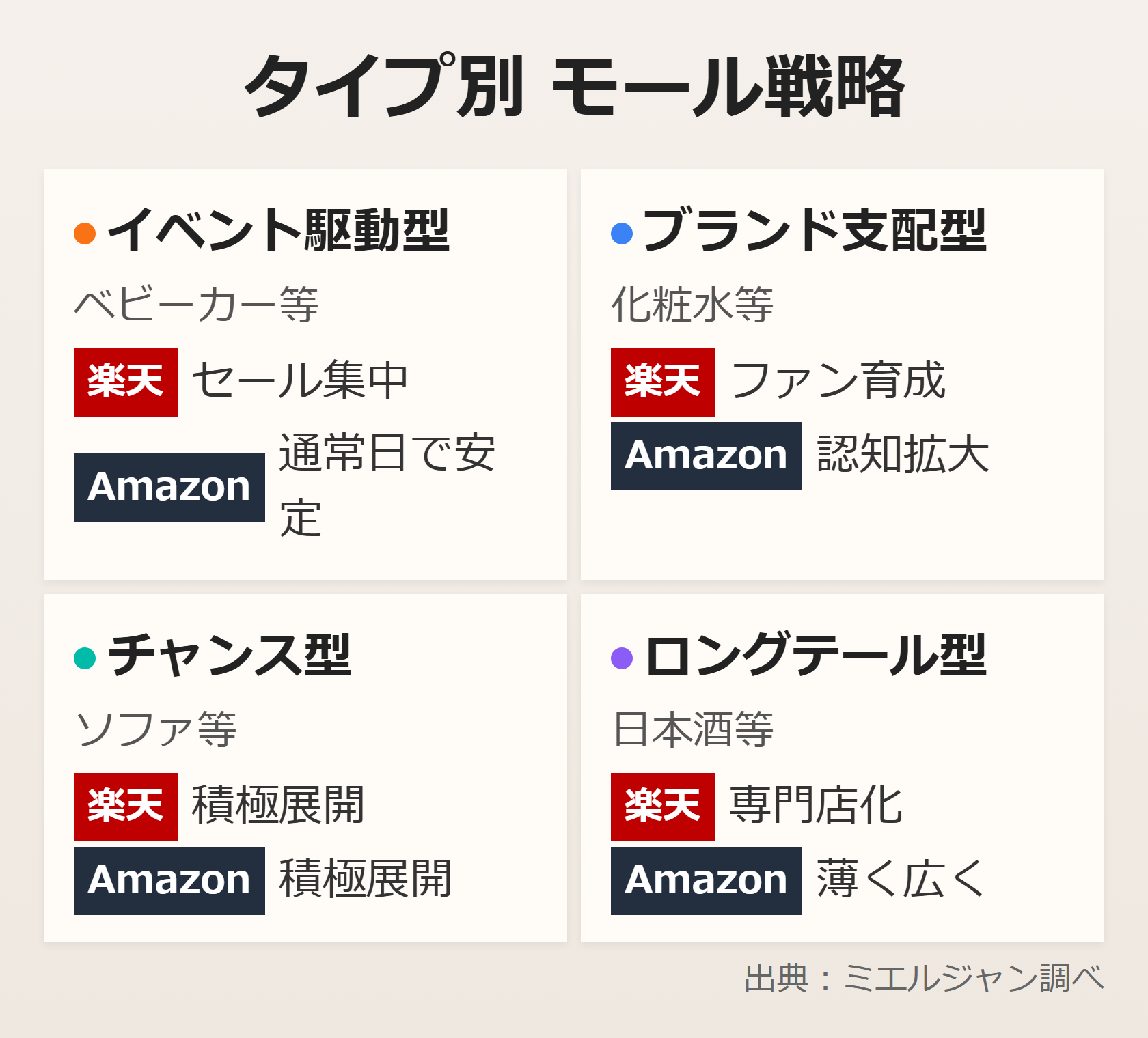 イベント駆動型 | 両モール均等 | 楽天のイベント売上 + Amazonの安定売上で平準化 |