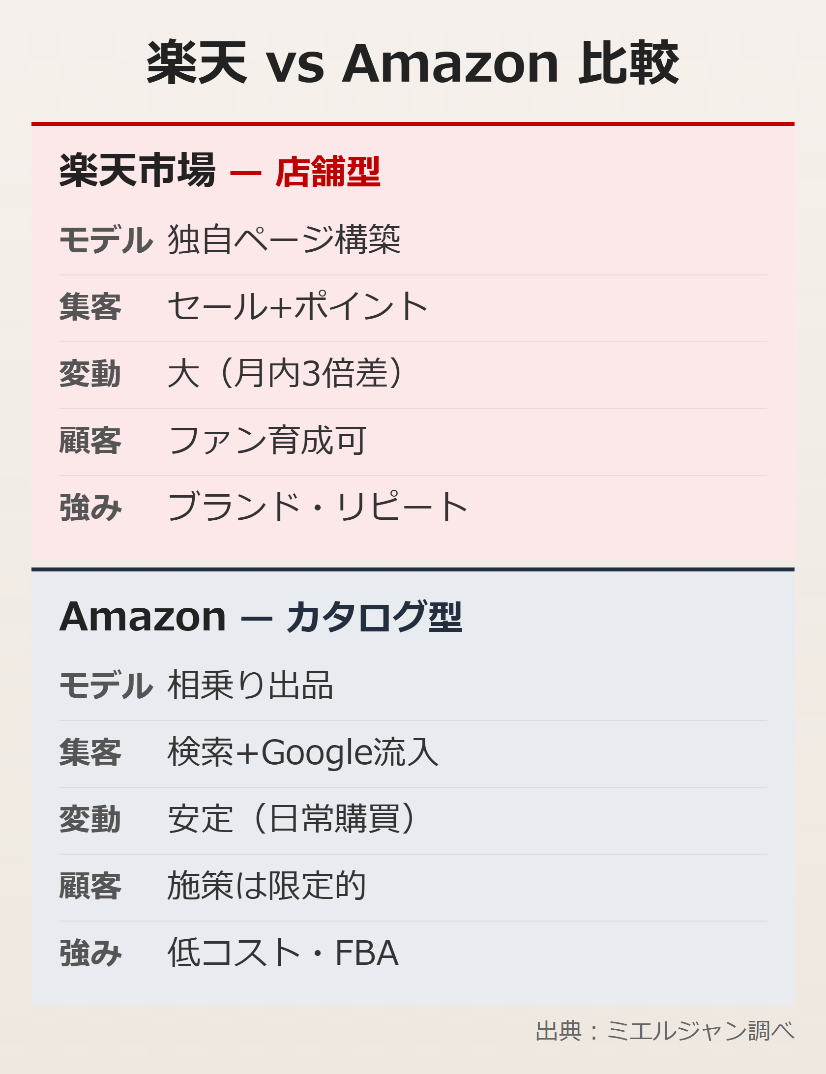 主な流入元 | 楽天内検索 + イベント | Amazon内検索 + Google |