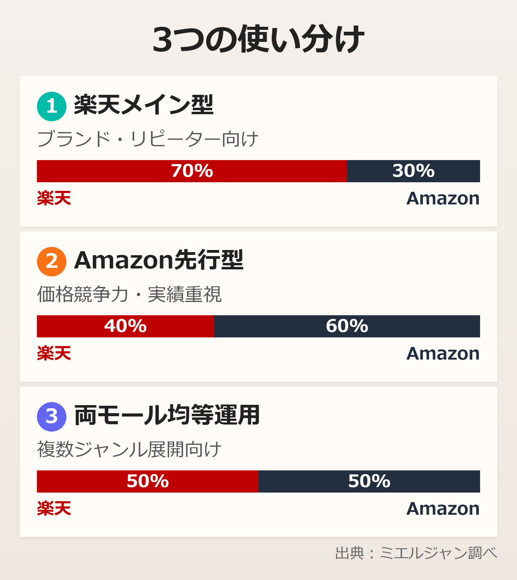ここまでの比較を踏まえて、楽天市場とAmazonをどう使い分けるべきかを3つのパターンで整理します。